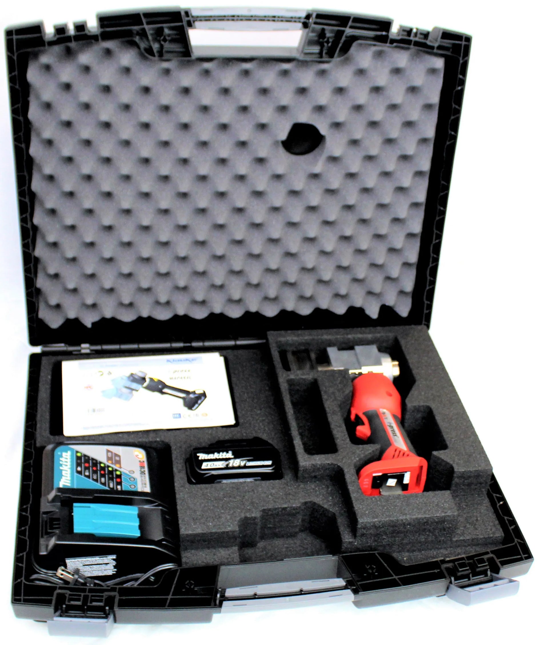 The packaged tooling system consist of two specially designed kits, the hydraulic press tool kit with its companion 18 volt battery and charger, and the quick-change clamps and inserts kit with sliding clamps and tool inserts to fit 1/4 through 1 5/8 inch fittings.